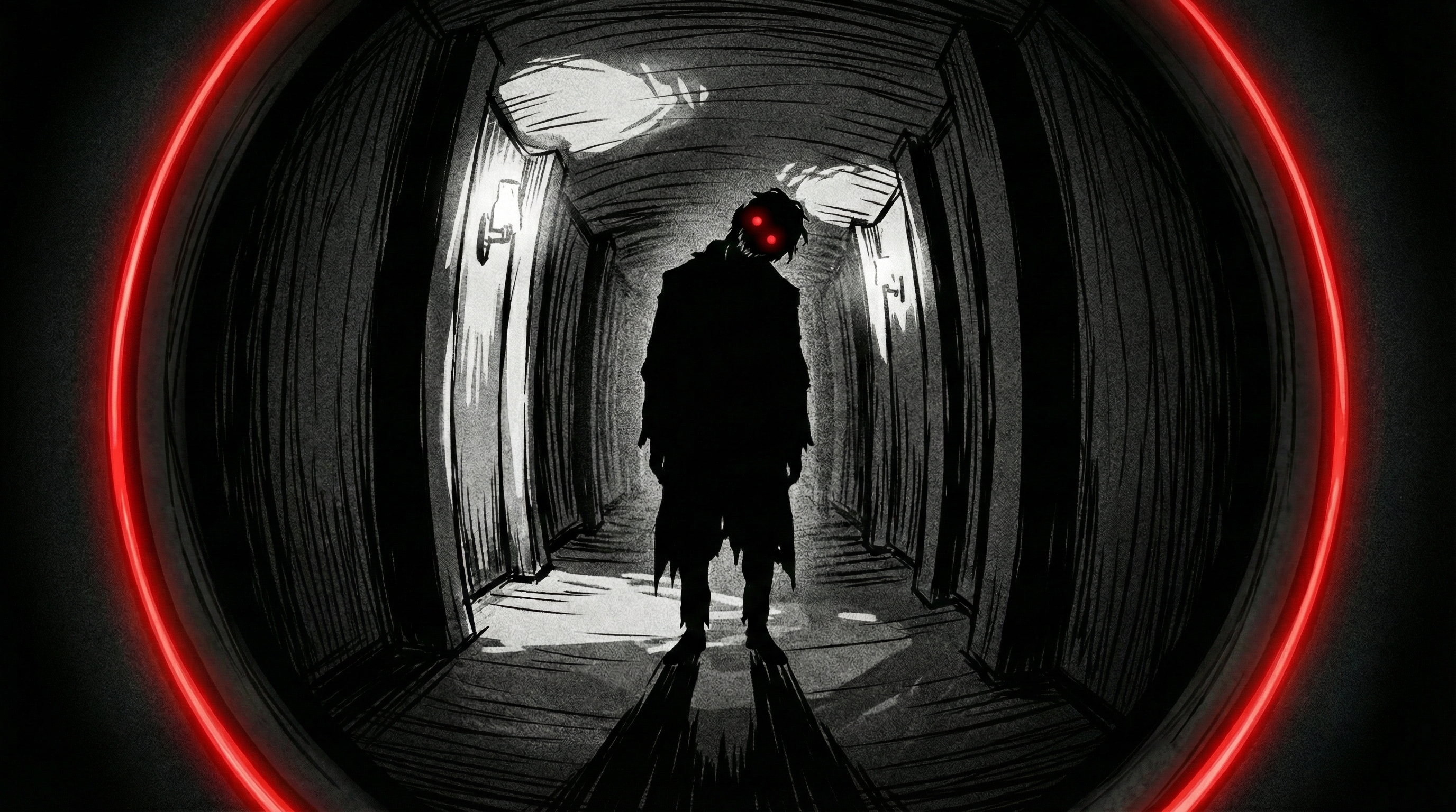 혹시나 하는 마음에 현관문의 외시경으로 복도를 내다본 지영은 그대로 얼어붙고 말았다. 꺼진 센서등 사이로 짙은 어둠이 깔린 복도, 옆집 남자가 지영의 집 문 바로 앞에 미동도 없이 서 있었다. 그는 아무런 소리도 내지 않은 채, 오직 지영의 집 문을 향해 아주 천천히 고개를 까딱거리고 있었다. 마치 문 너머에 있는 지영의 공포를 즐기고 있는 듯했다.