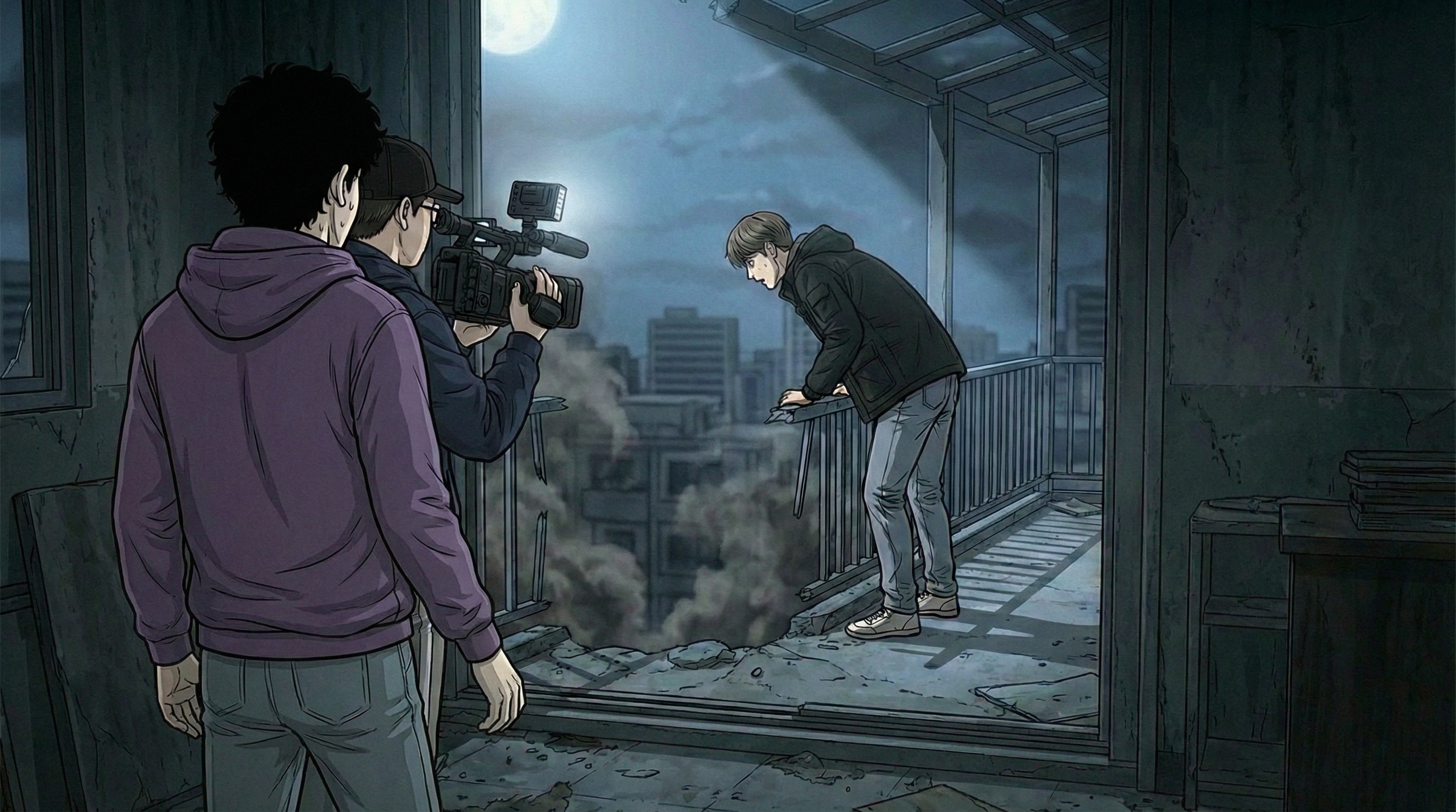 혼란 속에서 우빈은 현희를 바라보았다. 울고 있는 줄만 알았던 현희의 모습은 기괴했다. 그녀의 오른팔 근육은 짐벌 카메라의 수평을 유지하기 위해 아주 단단하게 긴장되어 있었고, 손가락은 부드럽게 줌 버튼을 당기며 상철이 추락한 구멍을 정확히 조준하고 있었다.